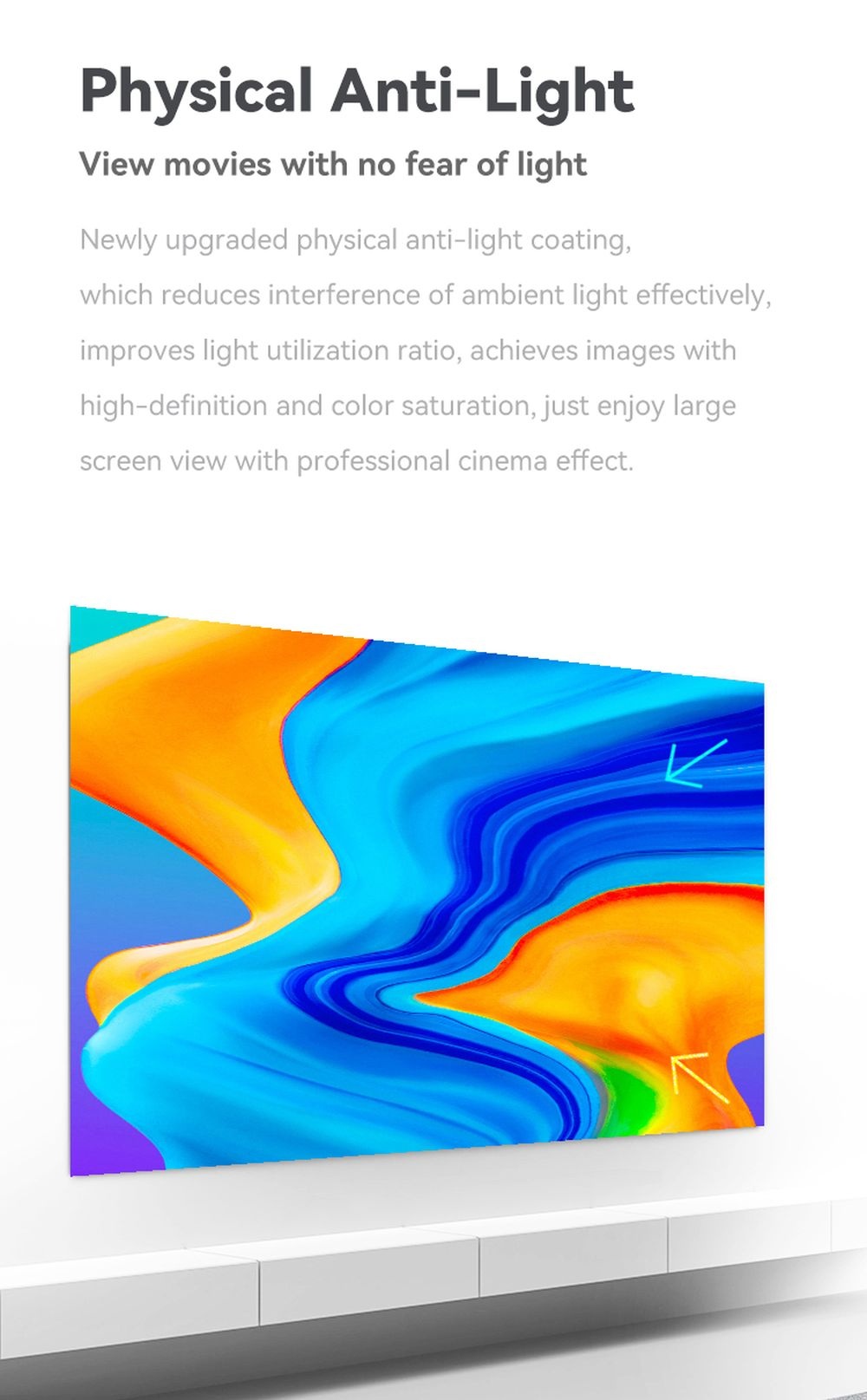 Vous aimez regarder un film à la maison, mais vous n'aimez pas la taille de votre télévision et la qualité de l'image de votre projecteur mural laisse à désirer ? Alors commandez vite cet écran de projection pratique et extra-large de Wanbo ! La technologie antireflet bloque la lumière extérieure et ne laisse passer que les images du projecteur. Ainsi, vous n'avez plus d'images délavées pendant la journée, mais vous pouvez regarder le film ou la série avec une grande luminosité !