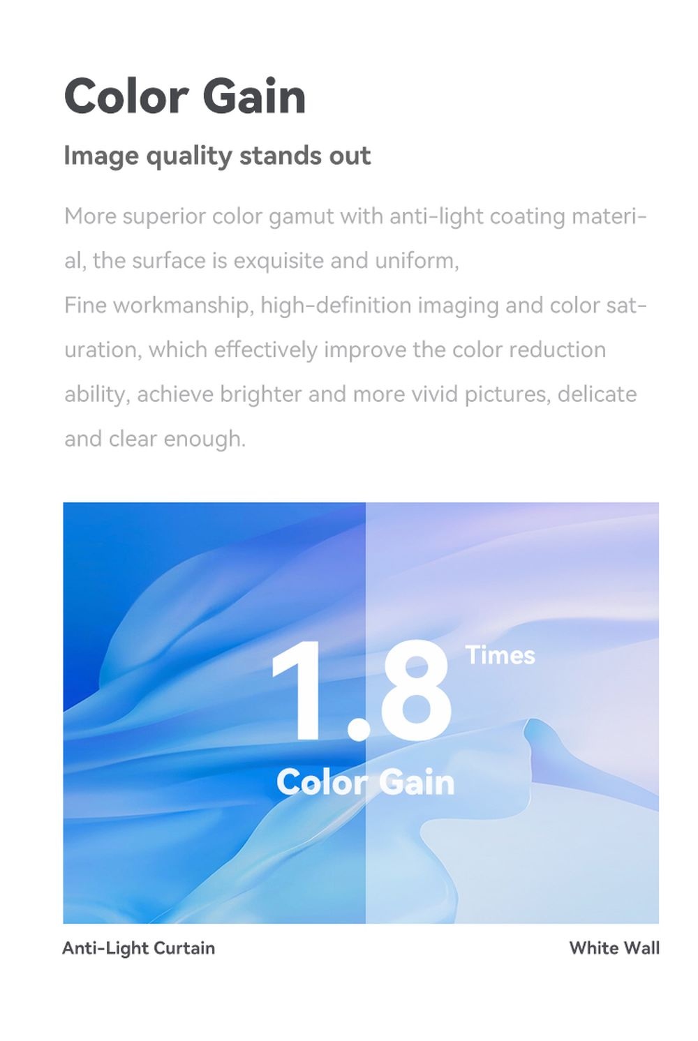 La surface de projection Wanbo est fabriquée en polyester et se compose de trois couches très fines. Ensemble, elles garantissent que les images de votre projecteur sont affichées en grand format et avec une netteté exceptionnelle. Grâce à une technologie spéciale intégrée à la toile, les couleurs sont affichées de manière encore plus lumineuse et plus vive, jusqu'à 1,8 fois par rapport à un mur blanc normal.