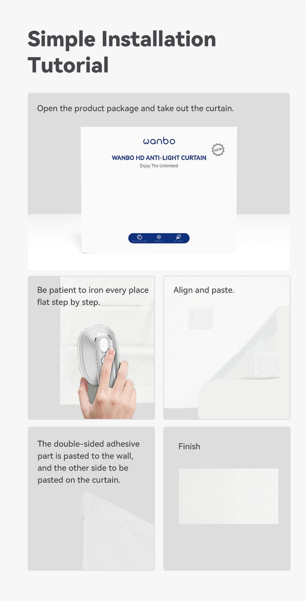 Ce rideau anti-lumière de Xiaomi Wanbo est facile à appliquer à l'aide des bandes adhésives incluses. Vous ne l'utilisez pas ? Vous pouvez alors le replier facilement. Comme il est très léger, vous pouvez facilement le transporter avec vous. Le matériau est infroissable, vous pouvez donc l'utiliser dans différents endroits !