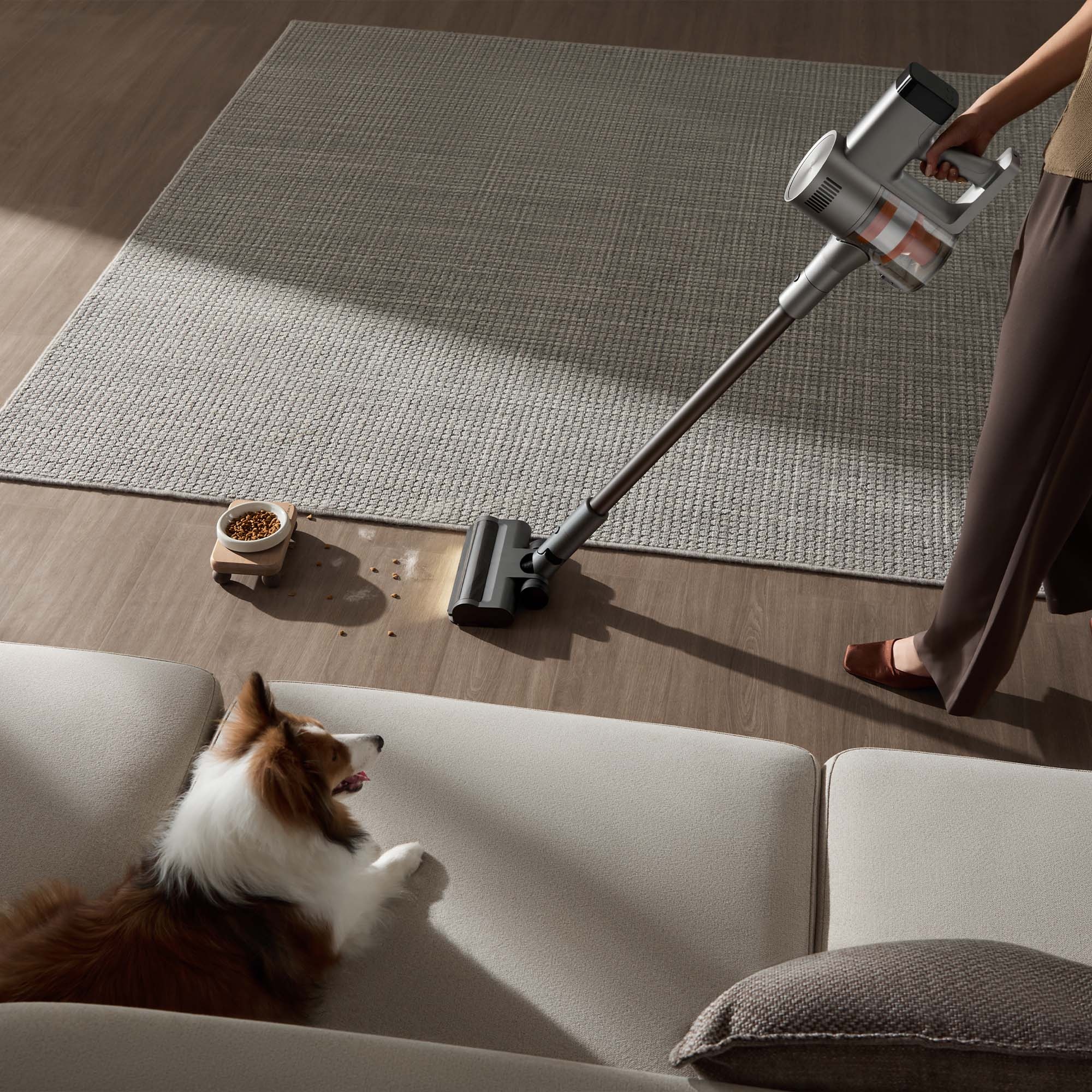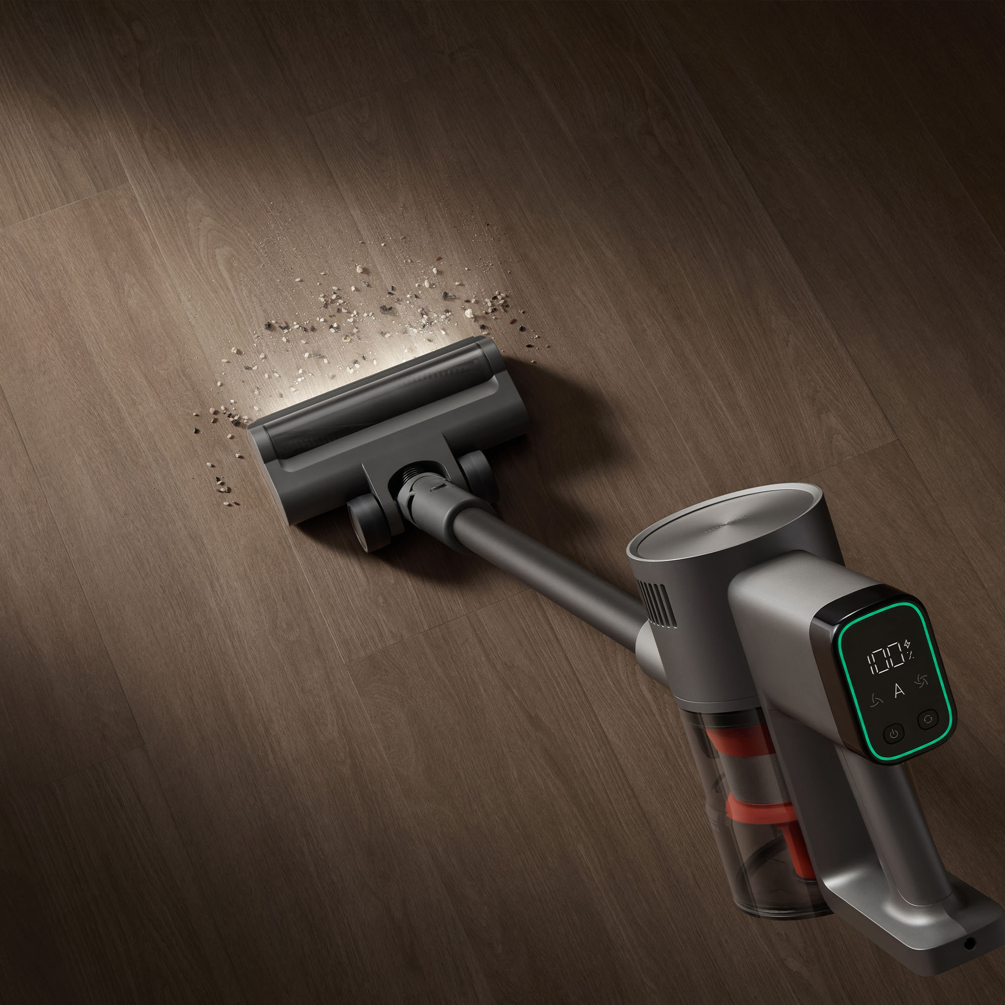 De stofzuiger heeft een digitaal display dat de reinigingsstatus bijhoudt. Je ziet de gekozen stand, de zuigkracht en hoe vuil de vloer is. In de automatische modus verandert de kleur van de indicator mee met het stofniveau. Zo heb je tijdens het schoonmaken direct inzicht in hoe schoon het oppervlak is en wat de stofzuiger op dat moment doet.